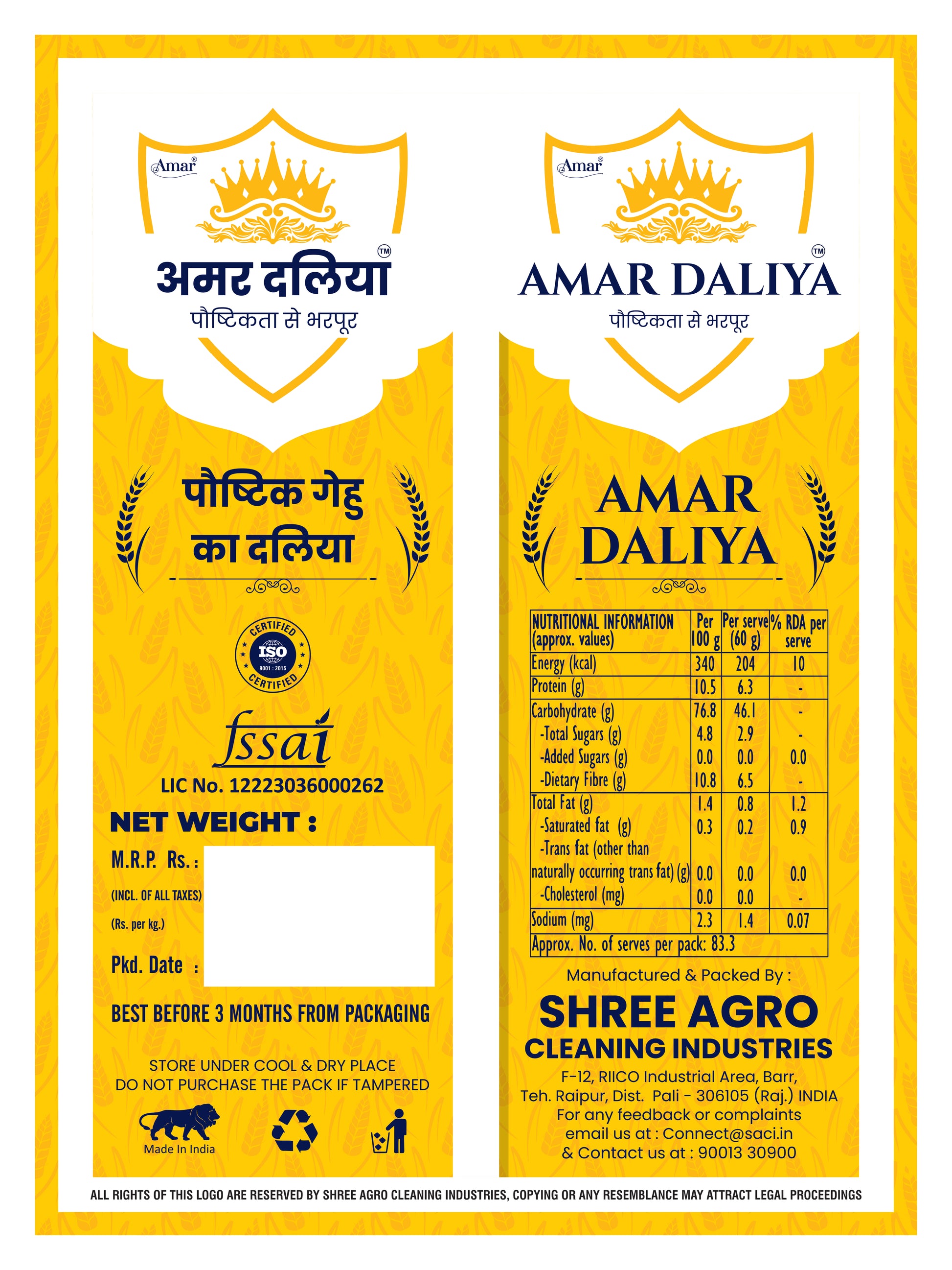 Amar Daliya is made from the finest quality wheat, carefully processed to retain its natural nutrition, fiber, and taste. A wholesome and versatile food, it is rich in proteins and essential nutrients that make it an ideal choice for a healthy lifestyle. Whether prepared as a light breakfast, nutritious porridge, or a traditional dish, Amar Daliya delivers purity, freshness, and goodness straight from the farms. With every pack, we promise the strength of grains and the trust of Amar Agro Products.